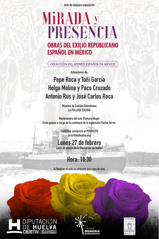 El Salón de Plenos de la Diputación de Huelva acoge mañana, a las 18.30 horas, la clausura de la la exposición ‘Mirada y Presencia. Obras del exilio republicano español en México’, que desde el pasado 16 de enero se expone en la Sala de la Provincia. Vinculada con la memoria histórica y democrática de España y compuesta por 40 de las 300 obras de exiliados republicanos que conserva el Ateneo Español de México, la muestra ha cruzado el océano por primera vez hasta Huelva gracias al Comisionado para la Memoria Democrática de la Diputación, con el apoyo del Ministerio de Memoria Democrática del Gobierno de España, la Fundación Kaluz y el propio Ateneo.
