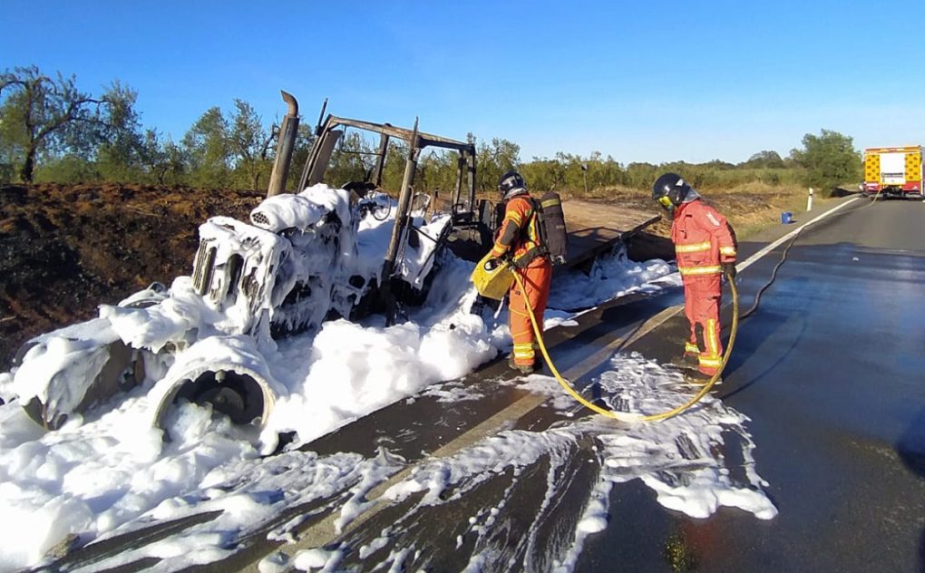 Efectivos del Consorcio Provincial de Bomberos de Huelva, proce4dentes del parque de Almonte, sofocaron este domingo un incendio cuyas causas se desconocen y que calcinó un tractor con remolque en la carretera autonómica A-474.