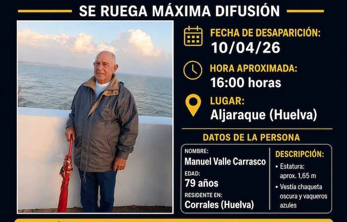 Las autoridades han activado un dispositivo de búsqueda para localizar a Manuel Valle Carrasco, un vecino de 79 años residente en Corrales, cuya desaparición fue denunciada tras perderse su pista en la tarde del pasado viernes en el municipio de Aljaraque.