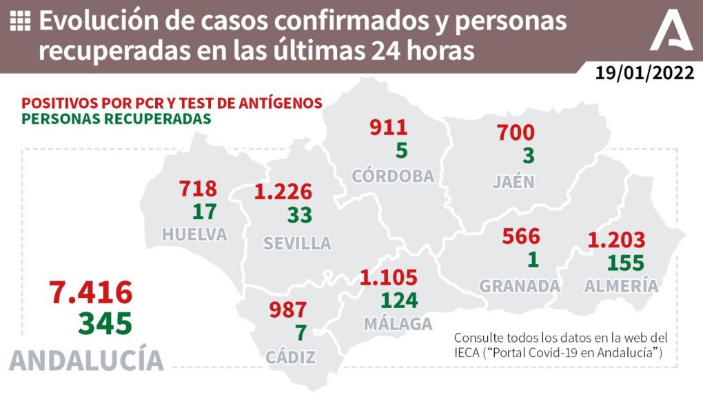 A nivel de Andalucía, los nuevos contagios detectados en las últimas 24 horas son 7.416, por lo que desde el inicio de la pandemia la comunidad autónoma suma 1.158.037 casos. Los fallecidos ascienden actualmente a 11.814 personas (28 más que ayer) y los curados a 905.638 (345 más que ayer).