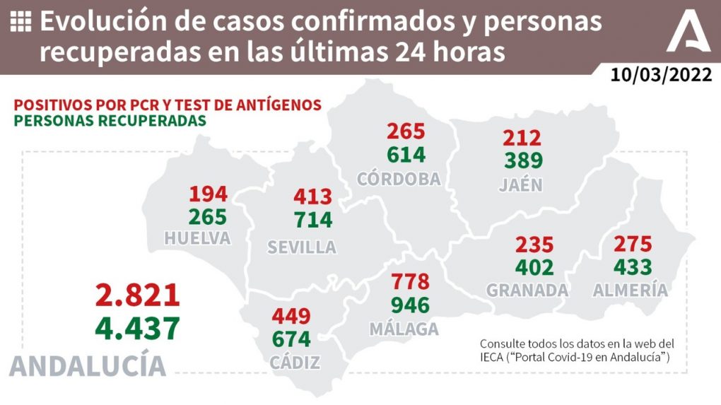 La Consejería de Salud y Familias de la Junta de Andalucía ha notificado estos datos en su parte de este JUEVES, 10 de MARZO, correspondiente a las últimas 24 horas.