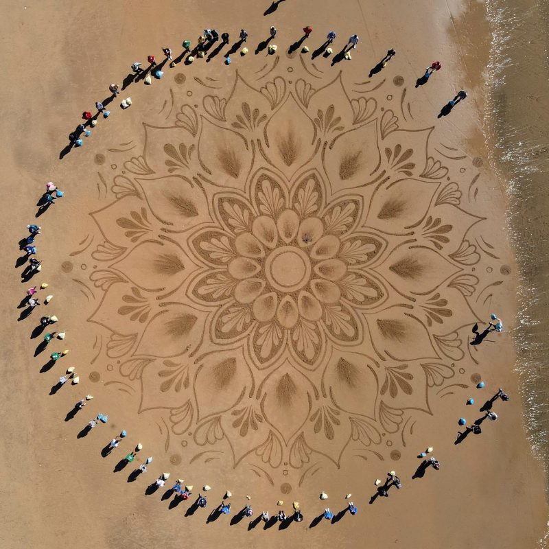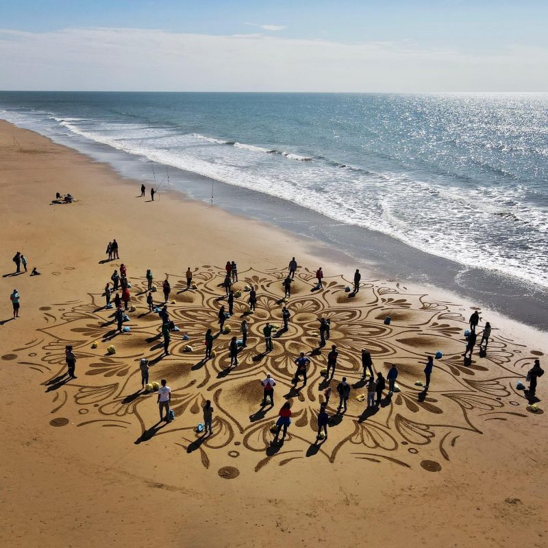 El artista barcelonés Quirze Codina Estevadeordal ha visitado este fin de semana de nuevo la provincia de Huelva, esta vez para dibujar sobre la arena de la playa del Parador de Mazagón un mandala gigante con un mensaje claramente medioambiental.